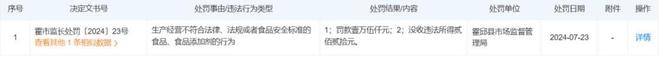 值得一提的是,天眼查信息显示,2024年,安徽百食轩生态农业有限公司曾因过氧化值(以脂肪计)项目不符合要求,检验结论为不合格,被霍邱县市场监督管理局罚款1.5万元,没收违法所得220元。