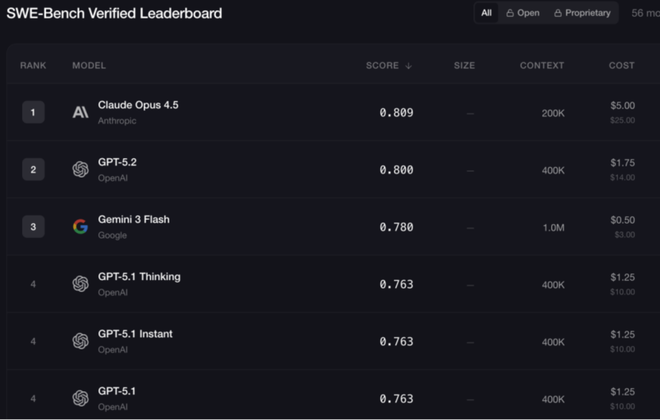 SWE-Bench Verified排名前五的模型来自Anthropic、OpenAI、谷歌。
