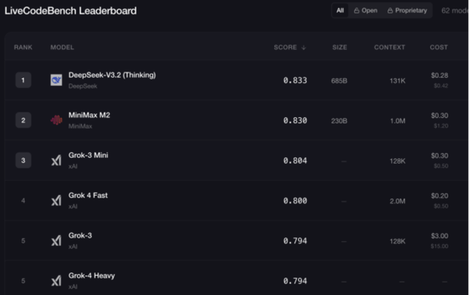 在Live Code Bench中,xAI表现较好,Grok-3 Mini、Grok 4 Fast、Grok-3分别排在第三、四、五位。这是一个全面且无污染的大型代码语言模型评估基准。它持续从编程竞赛中收集新问题,以便评估模型训练截止后发布的未见过的问题。