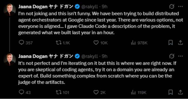谷歌首席工程师、Gemini API负责人Jaana Dogan公开表示,她只用几句提示词、一个多小时,就借助Claude Code完成了相当于过去一年工作量的成果。