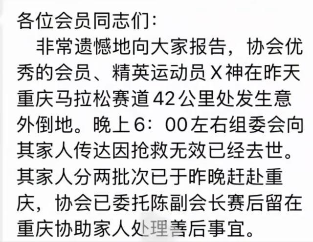 次日,网上有来自微信群的截图消息称,“非常遗憾地向大家报告,协会优秀会员、精英运动员X神在昨天重庆马拉松赛道42公里处发生意外倒地。晚上6:00左右组委会向其家人传达因抢救无效已经去世。其家人分两批已于昨晚赶赴重庆,协会已委托陈副会长赛后留在重庆协助家人处理善后事宜。”