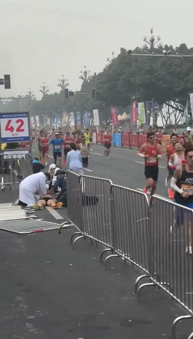 网上一段18秒视频显示,比赛现场一名选手倒在地上,医护人员正在按压做心肺复苏,旁边立有一块写有“42Km”字样的牌子。