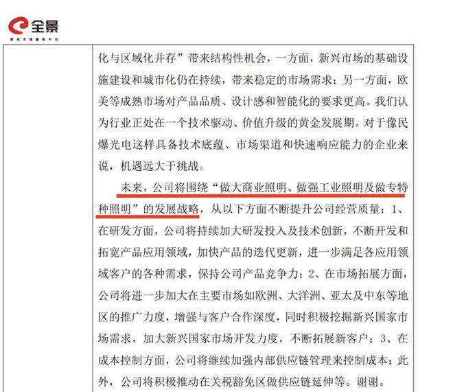 去年11月20日的业绩说明会上,面对投资者关于公司战略规划的提问,公司明确提出“做大商业照明、做强工业照明及做专特种照明”。