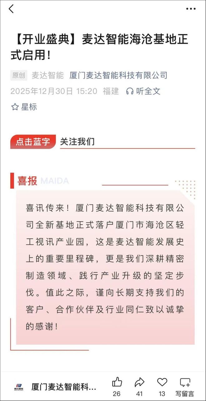 公开信息显示,2025年11月,厦门麦达刚被纳入2025年度厦门市重点上市后备企业新增名单,进入该名单的基本条件是“上市意愿明确,有近三年内开展上市相关工作的规划方案且具有可执行性”。