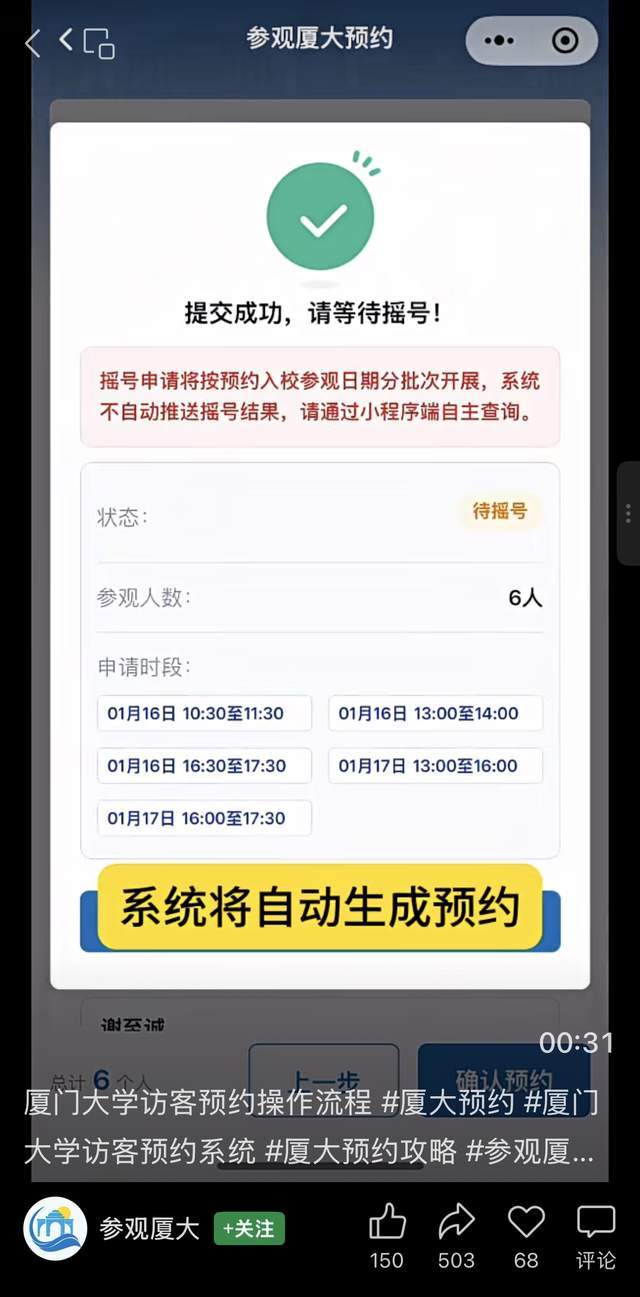 据厦门大学介绍,提前3天开放预约号段,按具体参观时间分批次放号、摇号,摇中即获取入校资格。