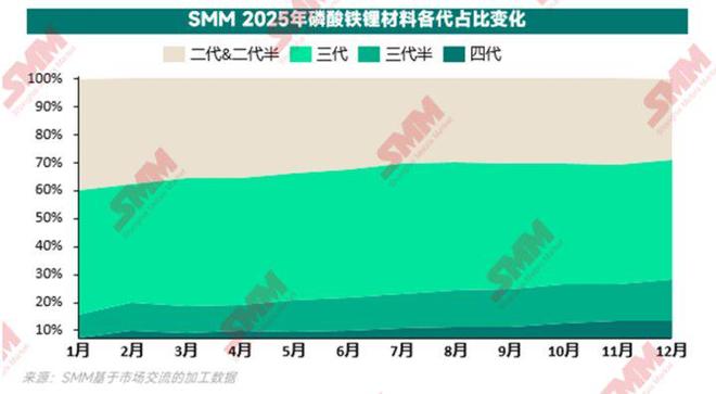 一般而言,业内根据压实密度的不同将磷酸铁锂划分为五代产品。根据SMM数据,2025年全年的磷酸铁锂产量中,三代(粉体压实密度达2.50g/cm³)占比约为44.8%;二代(粉体压实密度达2.40g/cm³)占比逐渐减少,约为33.5%;二烧品(三代半、四代)在持续增量,但受技术壁垒限制,生产企业数量与产能仍较少,占比分别11.5%和10.3%。![]()