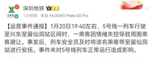 1月20日19:40左右,5号线一列车行驶至兴东至留仙洞站区间时,一乘客因情绪失控导致周围乘客避让。事发后,列车安全员及时将该名乘客带至留仙洞站进行安抚。事件未对5号线列车正常运行造成影响。