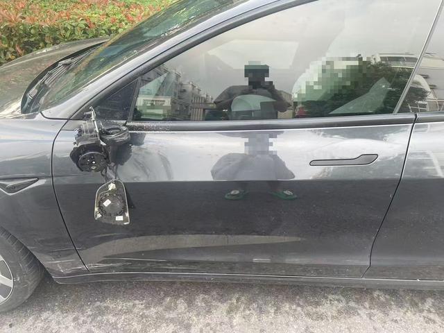 事故现场照片显示,被撞特斯拉为黑色,车辆的左侧后视镜已被撞掉,左侧叶子板和车门有明显划痕。