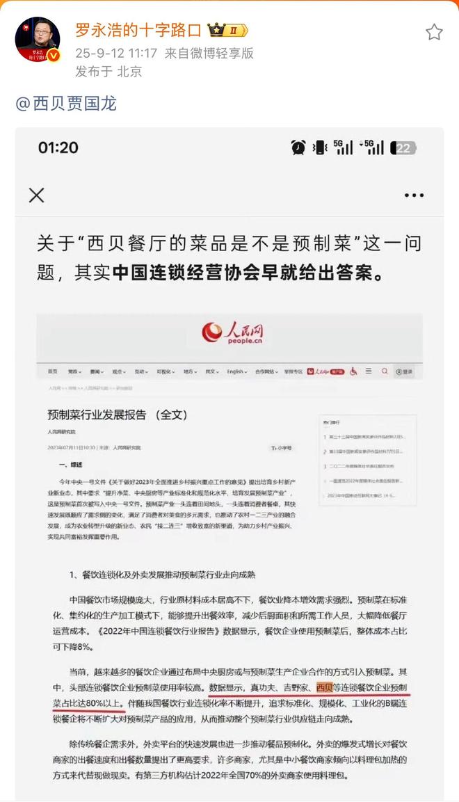 此外,罗永浩还转发了一份2022年的报告,该报告显示西贝预制菜占比80%以上,并且@了西贝贾国龙。