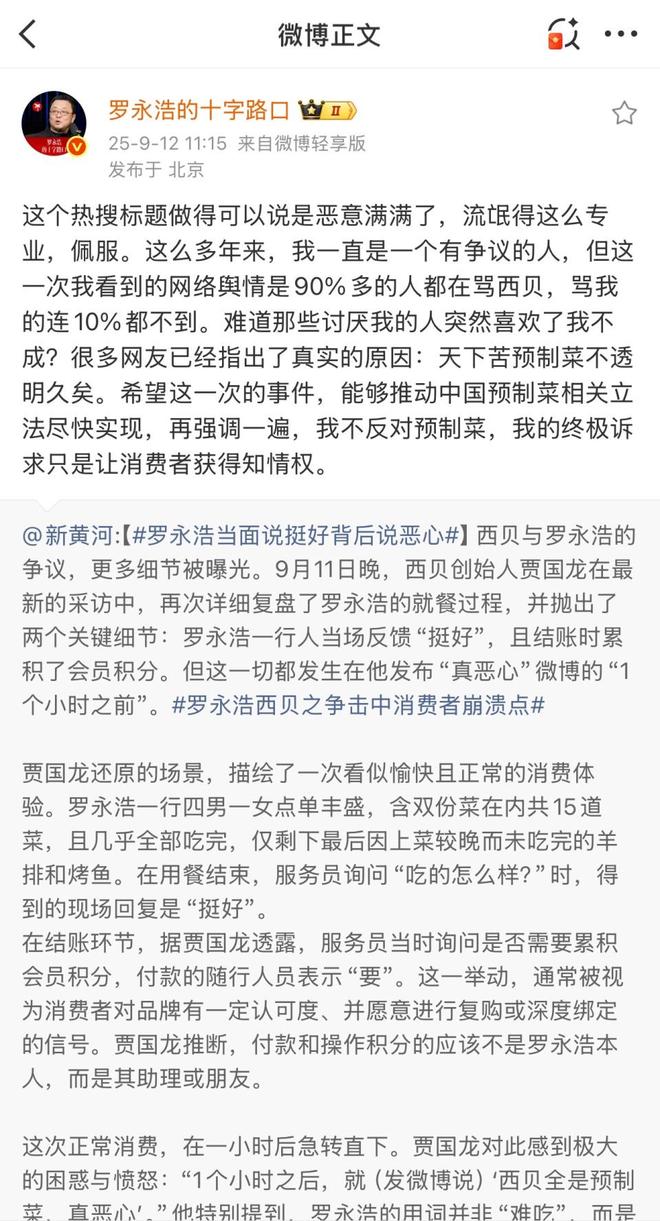 9月12日,罗永浩转发了一条带有“罗永浩当面说挺好背后说恶心”热搜话题的新闻,并称,“这个热搜标题做得可以说是恶意满满了,流氓得这么专业,佩服。这么多年来,我一直是一个有争议的人,但这一次我看到的网络舆情是90%多的人都在骂西贝,骂我的连10%都不到。难道那些讨厌我的人突然喜欢了我不成?很多网友已经指出了真实的原因:天下苦预制菜不透明久矣。希望这一次的事件,能够推动中国预制菜相关立法尽快实现,再强调一遍,我不反对预制菜,我的终极诉求只是让消费者获得知情权。”