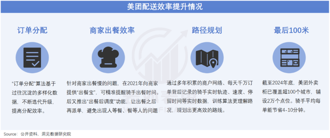 这需要很长时间的积累。美团外卖运营上的动作,从“订单分配”算法不断迭代,到推出“出餐宝”提醒骑手出餐时间,再到铺设100个城市2万个点位的外卖柜,目的不外乎挤掉水分,通过系统能力释放配送效率。
