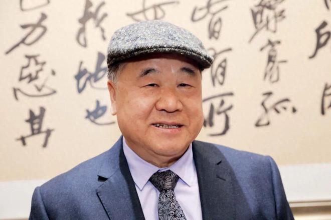 2023年5月18日,莫言在“壮游与长歌——莫言/王振 两块砖墨讯特展”上接受记者采访。图/中新
