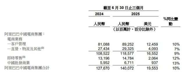 财报显示,经过4个月在即时零售业务上的布局,淘宝闪购赢得显著市场份额,8月前三周带动淘宝app的月度活跃消费者同比增长25%。同时,新组建的阿里中国电商集团,本季度营收同比增长10%,CMR客户管理收入也增长10%,电商业务保持稳定。