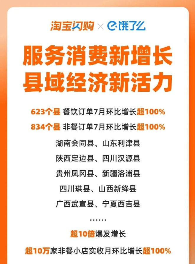 从结果来看,县域市场及广大中小商家,的确爆发出了强劲的消费潜力。淘宝闪购7月数据显示,有623个县的餐饮订单相比6月实现翻倍增长,834个县的非餐订单环比翻倍增长。