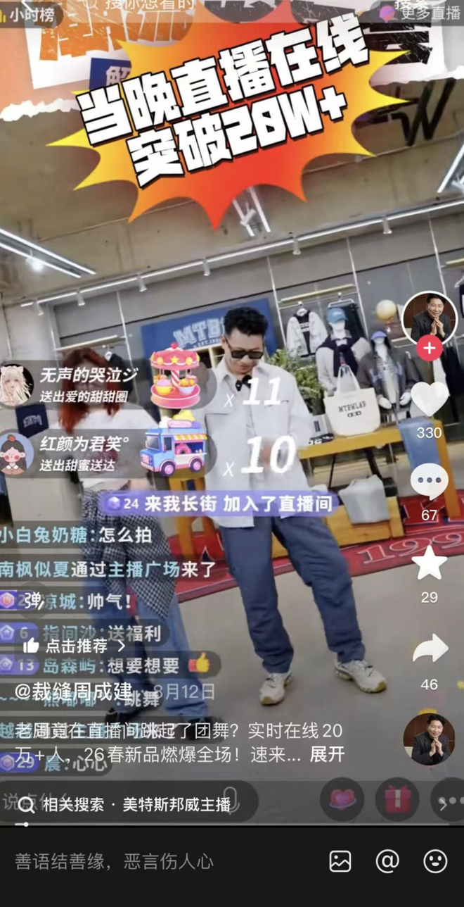 今年七夕活动中,京东找来人气女团和男团试水团播带货。前不久,已年近60岁的美特斯邦威创始人周成建与年轻员工在直播间跳起团舞,试图通过这种方式重新定义美特斯邦威的品牌形象。