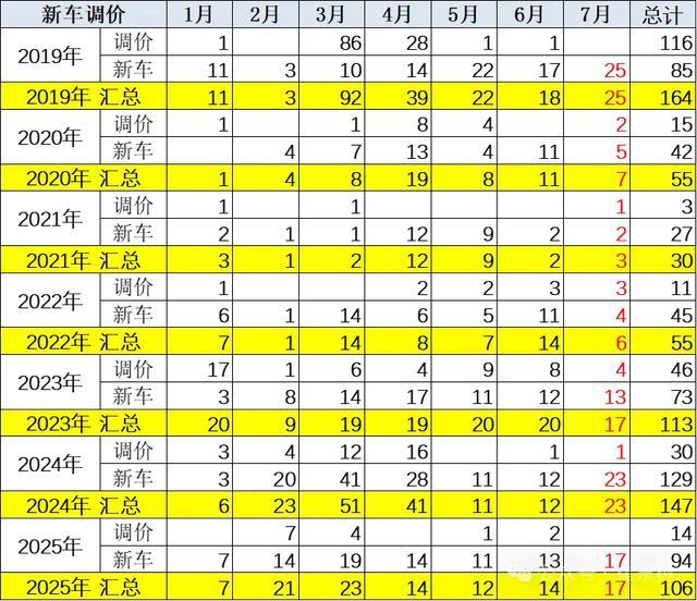 2020-2022年1—7月的车企降价车型仅有50款左右;2023年同期,数量猛增至113款;2024年1—7月,降价车型进一步提升至147款;今年1—7月,降价新车数量为106款。