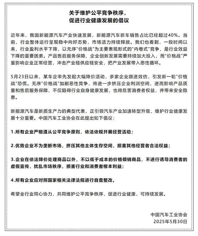 6月3日,全国工商联汽车经销商商会也发声,指出价格战已对经销商经营造成严重冲击,呼吁全行业抵制“内卷式”竞争,维护公平健康的市场环境,推动汽车产业实现高质量发展。