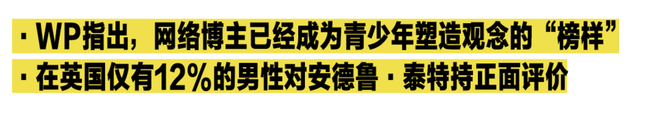 2025年Statista针对安德鲁·泰特的一项调查显示,78%的男性听说过他,但仅有12%的男性对他持正面评价,这一比例较2024年下降了18%。