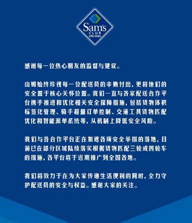 山姆始终珍视每一位配送员的辛勤付出,更将他们的安全置于核心关怀位置。我们一直与各家配送合作平台携手推进和优化相关安全保障措施,包括货物体积标签化管理、骑手超量订单控制、交通工具货物匹配优化和智能派单系统等,从机制上降低安全风险。 我们与各合作平台正在加速各项安全举措的落地,目前已在部分区域陆续落实根据货物匹配三轮或四轮车的措施,各平台将于近期推广到全国各地。