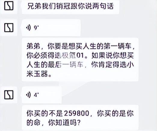 而这名销售人员在得知情况后,发语音说,“你要是想买人生的第一辆车,你必须得选极氪01,如果你想买人生的最后一辆车,你肯定得选小米YU7,你买的不是259800,你买的是你的命,你知道吗?”这样的回应也让消费者感到不适,并回复“没必要吧,咒我?”