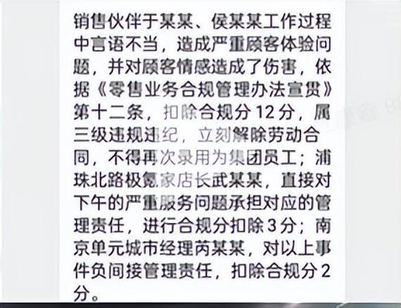 随后该消费者发帖称,极氪汽车相关负责人在得知情况后,已经和他沟通了后续的处理情况,该负责人表达了歉意,“我们的销售伙伴和主播伙伴表述极为不得体,这不是公司和团队的本意,也违背了品牌行为规范”。此外,这名负责人在给消费者的回复中表示,涉事的两名工作人员已经被解除了劳动合同,且不得再次录用为集团员工。