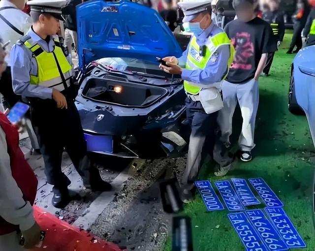 接到报警后,民警立即开展核查处置,并在现场迅速锁定目标车辆。经查,一辆“兰博基尼”和一辆“阿斯顿马丁”跑车上,均悬挂了举报中提及的“豹子号”车牌。经初步核查,这两块号牌均为伪造。民警在进一步搜查中,在“兰博基尼”车内查获大量尚未使用的伪造“豹子号”车牌。