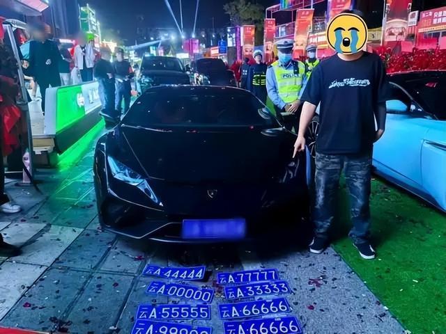 昆明市公安局交管支队三大队接到群众举报线索,称一酒吧门口停放多辆豪华跑车,部分车辆悬挂“云A·00000”“云A·33333”“云A·44444”“云A·55555”“云A·66666”“云A·77777”“云A·99999”等“豹子号”车牌,疑似伪造车牌。