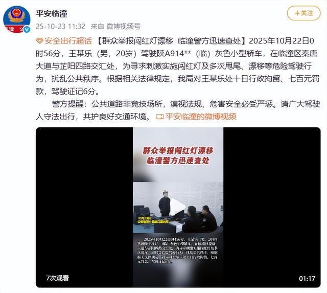 2025年10月22日0时56分,王某乐(男,20岁)驾驶陕A914**(临)灰色小型轿车,在临潼区秦唐大道与芷阳四路交汇处,为寻求刺激实施闯红灯及多次甩尾、漂移等危险驾驶行为,扰乱公共秩序。根据相关法律规定,我局对王某乐处十日行政拘留、七百元罚款,驾驶证记6分。