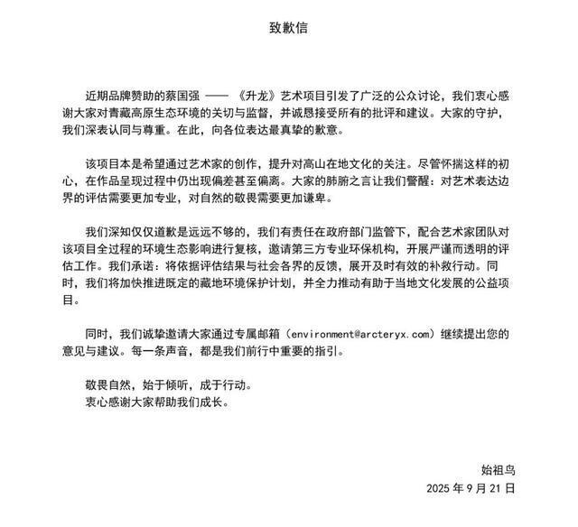 9月20日,蔡国强和“始祖鸟”品牌方删除相关视频。此后,蔡国强工作室及始祖鸟也就此事致歉。