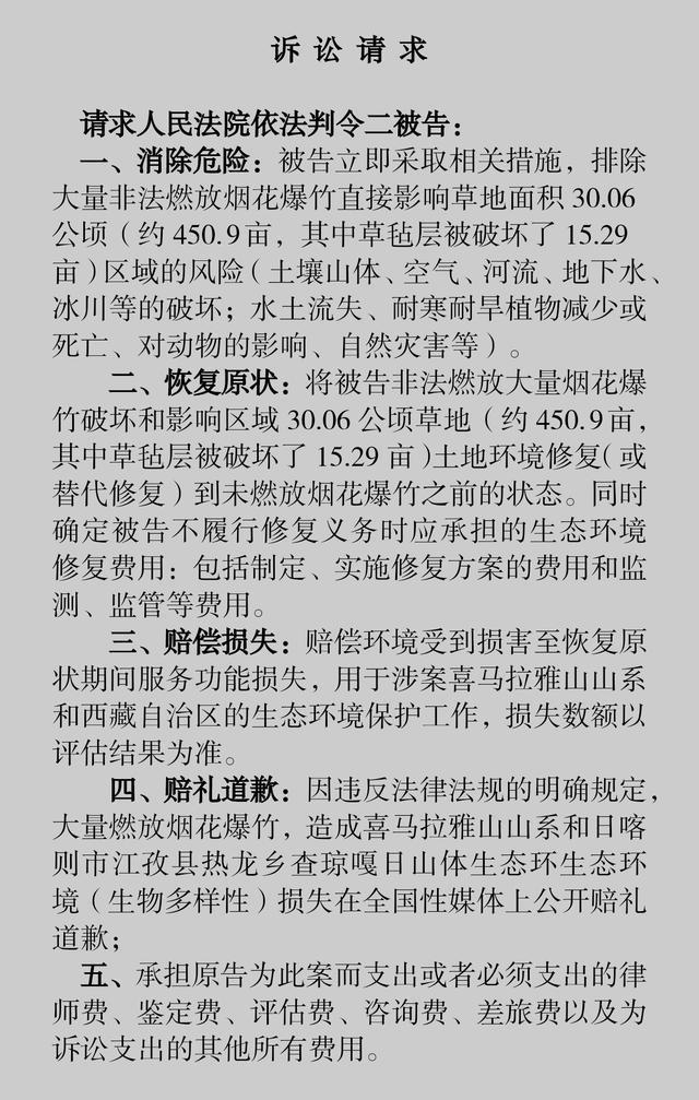 赔偿环境受到损害至恢复原状期间服务功能损失,用于涉案喜马拉雅山山系和西藏自治区的生态环境保护工作。对大量燃放烟花爆竹,造成喜马拉雅山山系和日喀则市江孜县热龙乡查琼嘎日山体生态环境(生物多样性)损失在全国性媒体上公开赔礼道歉。