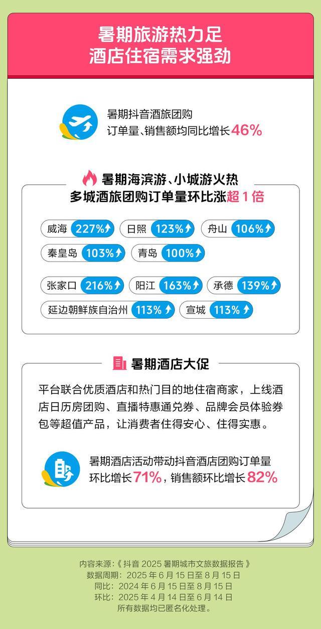 这个暑期,文旅关键词有苏超、研学游、非遗游、避暑、亲子游等。为方便用户出行,抖音生活服务联合优质酒店和热门目的地住宿商家,上线酒店日历房团购、直播特惠通兑券、品牌会员体验券包等超值产品,让消费者住得安心、住得实惠。这个夏天,抖音酒店团购订单量环比增长71%,销售额环比增长82%。