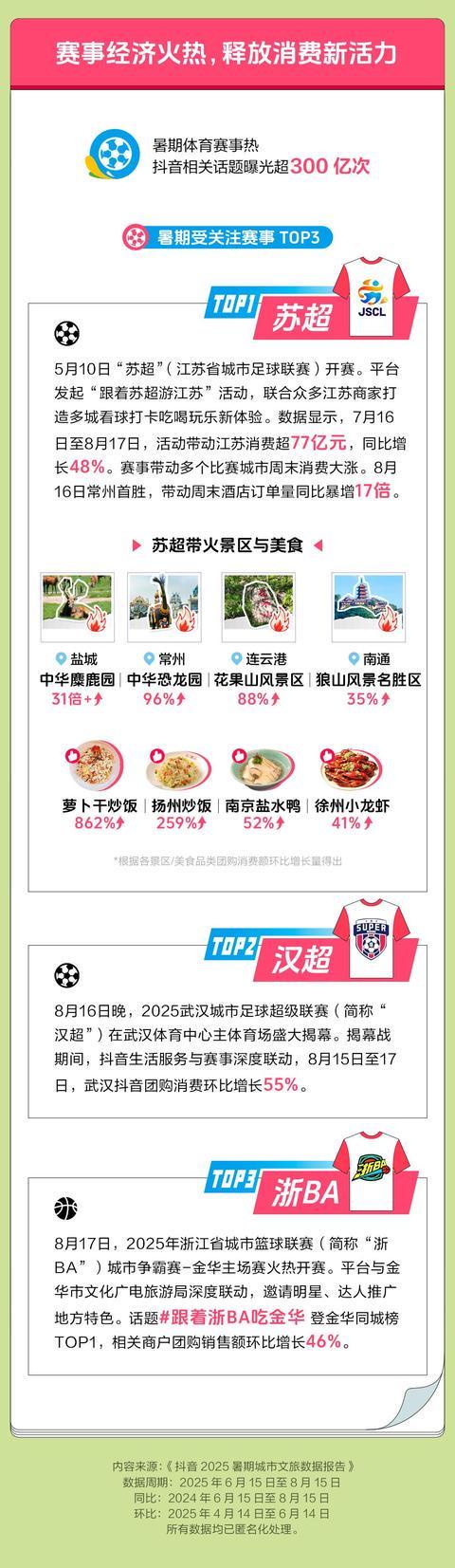 苏超(江苏省城市足球联赛)、汉超(2025武汉城市足球超级联赛)等体育赛事激发“赛事经济”,抖音相关话题曝光超300亿次。苏超带火中华麋鹿园、中华恐龙园等景区,也带火了扬州炒饭、南京盐水鸭等地域特色美食。抖音生活服务发起“跟着苏超游江苏”活动,带动江苏消费超77亿元,同比增长48%。8月15日汉超揭幕赛,武汉前后3天抖音团购消费环比增长55%。8月17日浙BA金华主场开赛,相关商户团购销售额环比增长46%。