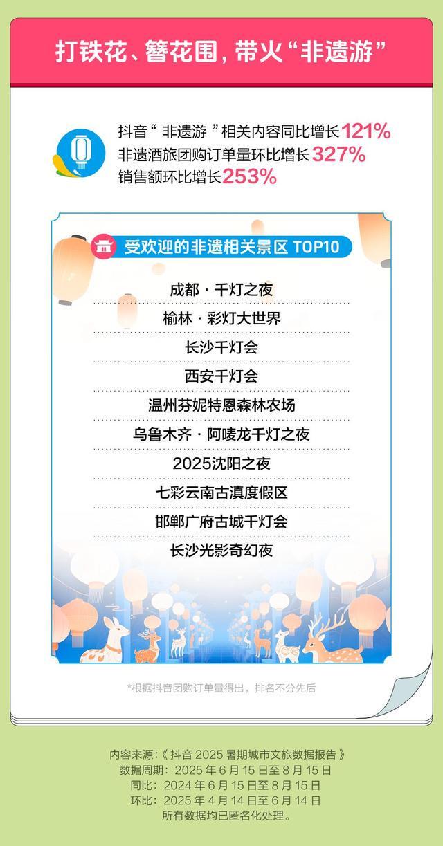 暑期,“非遗游”成为潮流。报告显示,抖音“非遗游”相关内容同比增长121%,非遗酒旅团购订单量环比增长327%,销售额环比增长253%。成都·千灯之夜、榆林·彩灯大世界、长沙千灯会、西安千灯会、温州芬妮特恩森林农场、乌鲁木齐·阿唛龙千灯之夜、2025沈阳之夜、七彩云南古滇度假区、邯郸广府古城千灯会、长沙光影奇幻夜入围暑期受欢迎的10大非遗相关景区。