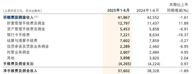 而在手续费及佣金收入中,财富管理手续费及佣金收入127.97 亿元,同比增长11.89%;资产管理手续费及佣金收入54.53亿元,同比下滑6.91%;银行卡手续费收入72.21亿元,同比下滑16.37%;