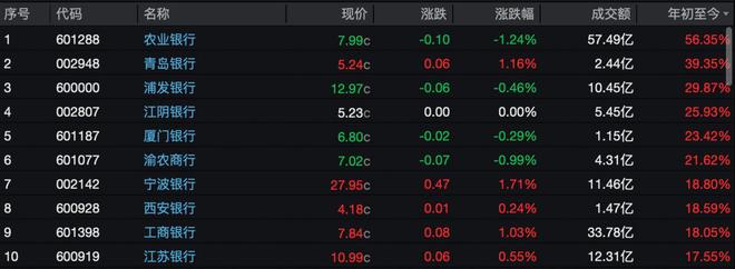银行板块年初至今股价涨幅榜前十,图片来源Wind