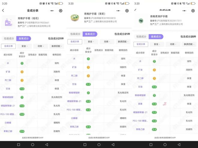 图 | 青稚三款不同护手霜的配方,三者唯一差别在于香精、保湿剂添加上,其实可以视为同一产品