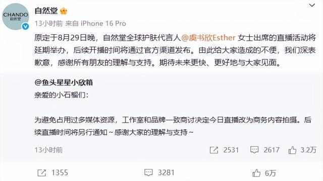 此外,自然堂官方账号发文:“原定于8月29日晚,自然堂全球护肤代言人虞书欣女士出席的直播活动将延期举办,后续开播时间将通过官方渠道发布。由此给大家造成的不便,我们深表歉意,感谢所有朋友的理解与支持。期待未来更快、更好地与大家见面。”