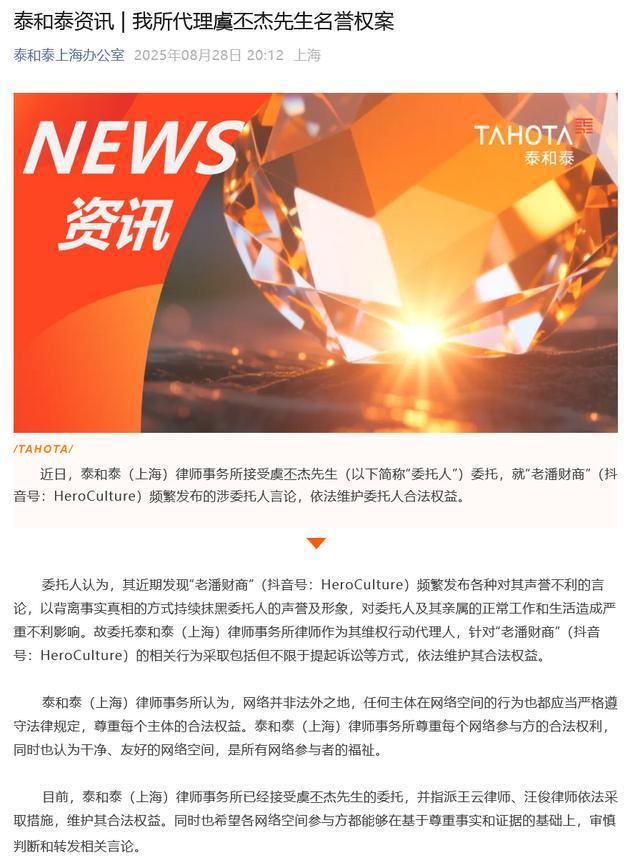近日,虞书欣因参与的综艺《一年级·毕业季》事件及“老潘财商”事件等引发热议。8月28日晚,泰和泰(上海)律师事务所宣布已经代理虞书欣父亲虞丕杰名誉权案。“委托人认为,其近期发现‘老潘财商’(抖音号:HeroCulture)频繁发布各种对其声誉不利的言论,以背离事实真相的方式持续抹黑委托人的声誉及形象,对委托人及其亲属的正常工作和生活造成严重不利影响。故委托泰和泰(上海)律师事务所律师作为其维权行动代理人,针对‘老潘财商’(抖音号:HeroCulture)的相关行为采取包括但不限于提起诉讼等方式,依法维护其合法权益。”