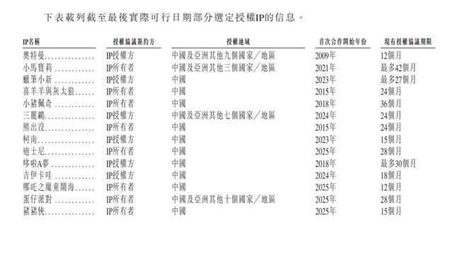 据金添动漫招股书,截至最后实际可行日期,金添动漫与奥特曼IP、喜羊羊与灰太狼IP、小猪佩奇IP及小马宝莉IP所有者合作已分别达16年、10年、7年和4年;现有授权协议期限依次为12个月、24个月、36个月和最多42个月。