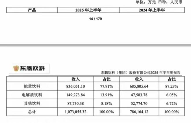 翻看东鹏饮料财报,2025年上半年,以东鹏特饮为主的能量饮料收入约83.60亿元,占总营收的77.91%,上年同期占比为87.23%。