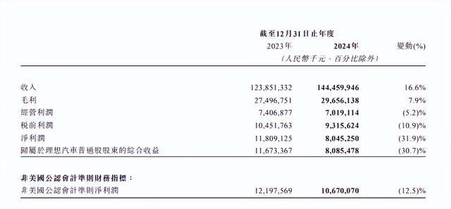 理想汽车2024年度财务报告显示,2024年,理想汽车全年收入总额达人民币1445亿元,同比增长16.6%,但是净利润同比减少31.9%,为人民币80亿元。