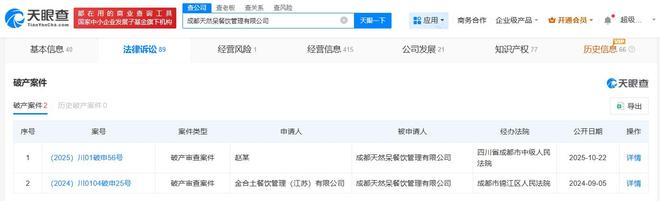 天眼查天眼风险信息显示,近日,成都天然呆餐饮管理有限公司新增一则破产审查案件,申请人为赵某,经办法院为四川省成都市中级人民法院。相关文书显示,该案件将于11月4日进行听证。