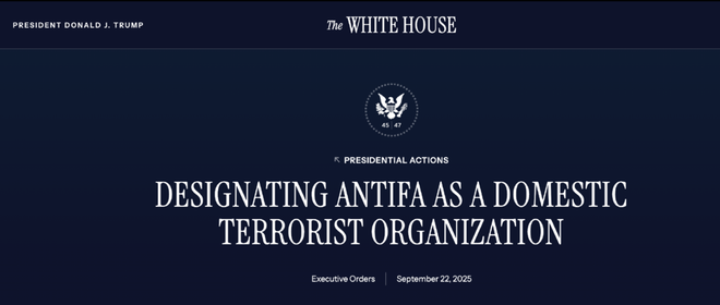 2025年9月22日,特朗普政府签署行政命令,将Antifa(指代一系列左翼激进反法西斯群体)指定为国内恐怖组织,称其是“一个军事化的无政府主义实体,公开呼吁推翻美国政府、执法机构和法律体系”。