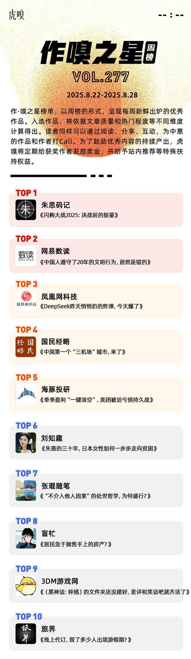 作·嗅之星榜单,以周榜的形式,呈现每周新鲜出炉的优秀作品。2025年8月22日~2025年8月28日,虎嗅第277期,作·嗅之星的获奖文章分别是: