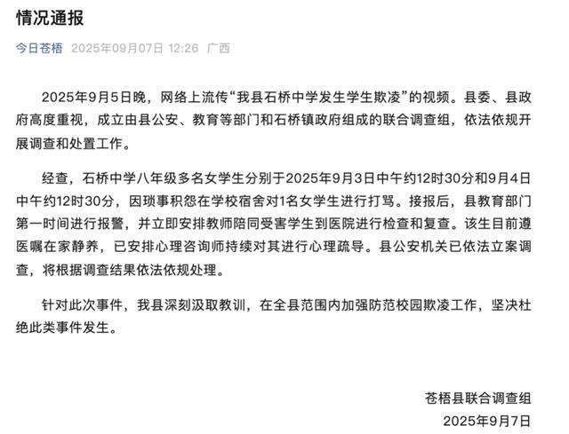 经查,石桥中学八年级多名女学生分别于2025年9月3日中午约12时30分和9月4日中午约12时30分,因琐事积怨在学校宿舍对1名女学生进行打骂。接报后,县教育部门第一时间进行报警,并立即安排教师陪同受害学生到医院进行检查和复查。该生目前遵医嘱在家静养,已安排心理咨询师持续对其进行心理疏导。县公安机关已依法立案调查,将根据调查结果依法依规处理。