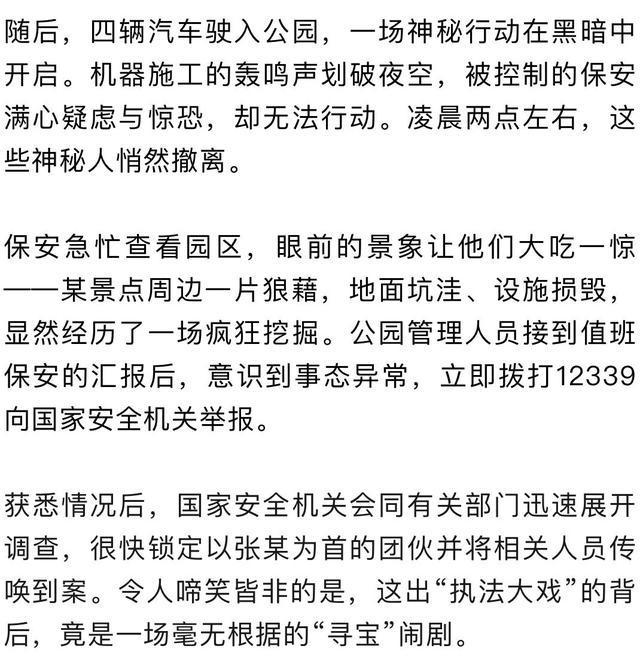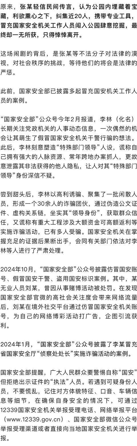 国家安全部通报:张某轻信民间传言,于午夜时分纠集近20人假冒国家安全部门人员,控制公园保安后封锁公园进行挖宝藏活动,该行为严重扰乱社会秩序和公共安全,相关部门已介入调查处理,提醒广大市民,不轻信传言,遵守法律法规,共同维护社会稳定。