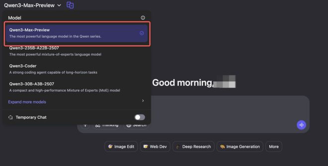 目前,Qwen3-Max-Preview已经可以体验,只需在模型下拉选项中选择即可:
