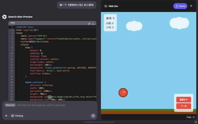 最后,我们再让Qwen3-Max-Preview生成一个小游戏: