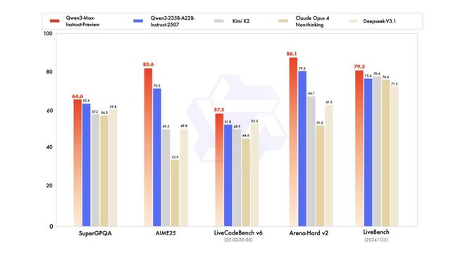 从下面的表格中不难看出,Qwen3-Max-Preview已经在SuperGPQA、AIME2025、LiveCodeBench V6、Arena-Hard V2和LiveBench等基准测试中,均超越了其它选手。
