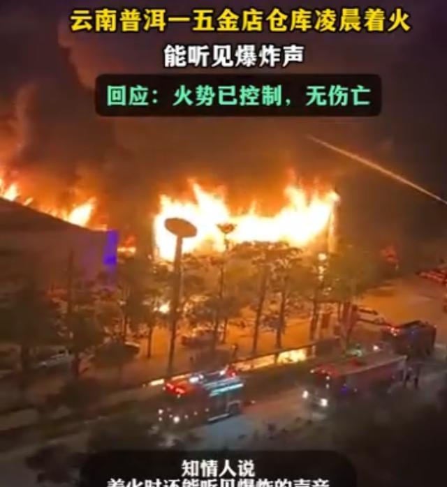 云南普洱一家五金店仓库凌晨发生火灾,现场能听到爆炸声,经过紧急救援,火势已得到控制,未造成人员伤亡,具体起火原因正在进一步调查中。